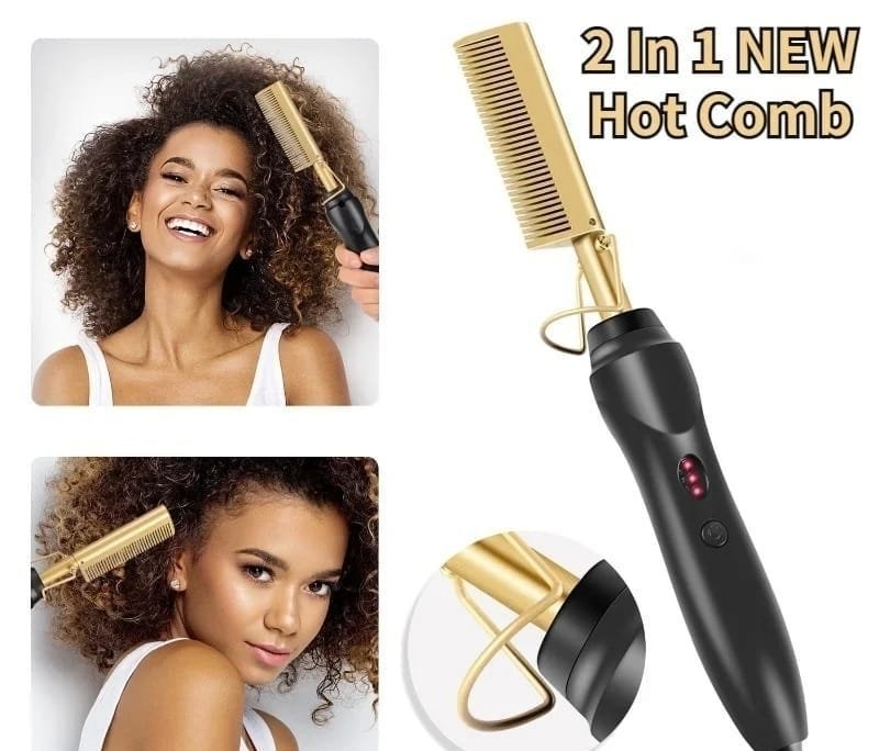 Product Description: The 2 In 1 NEW Hot Comb is a sleek, black-and-gold styling tool that combines a heated comb and a straightening brush in one device. It features a red LED indicator and an ergonomic handle for easy use, letting you smooth and style curly or textured hair with professional results.