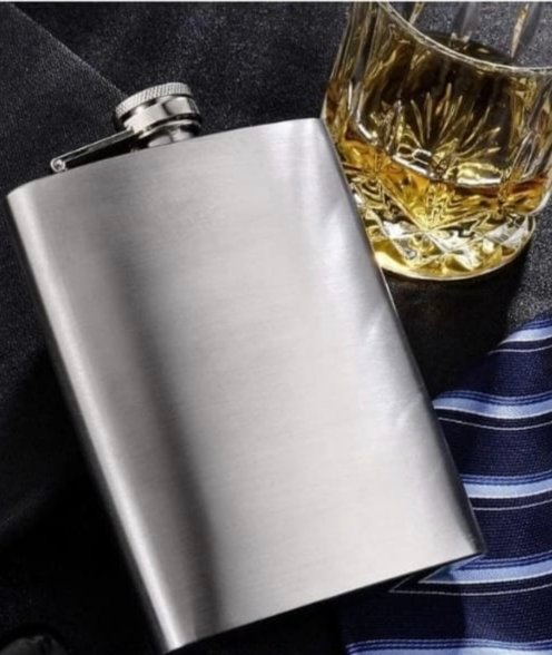 Product Description: A sleek, brushed‑finish stainless steel hip flask with a screw‑top cap and attached funnel. It’s designed for carrying your favourite spirits on the go, shown here paired with whiskey, boxed for gifting, and styled in various everyday settings (with a tie, on a bamboo tray, outdoors).
