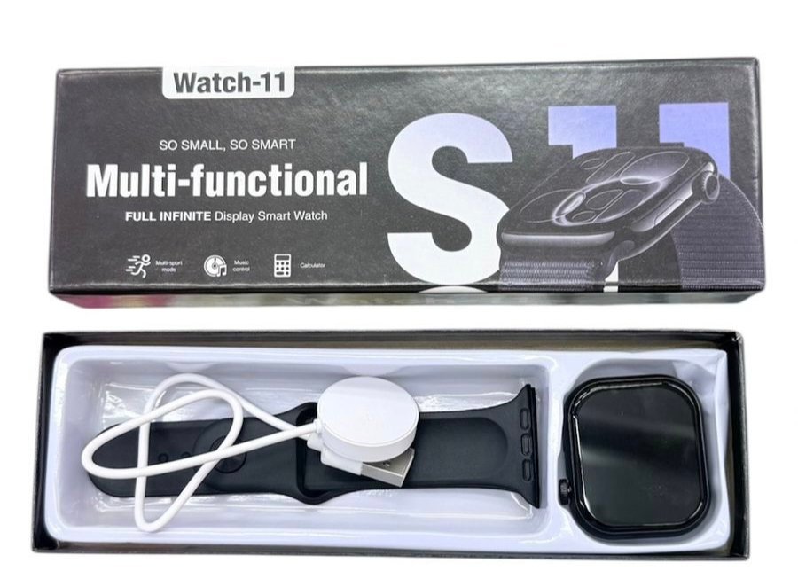 Product Description: The Watch-11 S11 is a sleek, black, full‑infinite display smartwatch marketed as “so small, so smart.” It comes in a compact box with a black silicone strap, a white magnetic charging cable, and an additional black screen protector. The watch features a square touch display and is positioned as a multi‑functional device with multi‑sport mode, music control, and a calculator.